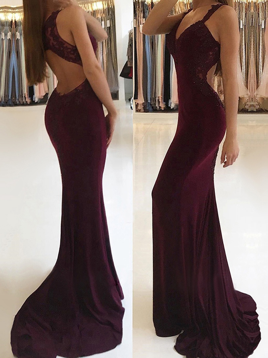 burgundy sleeveless v-neck prom dress fanshion dress,applique satin lace evening dress,SB0536