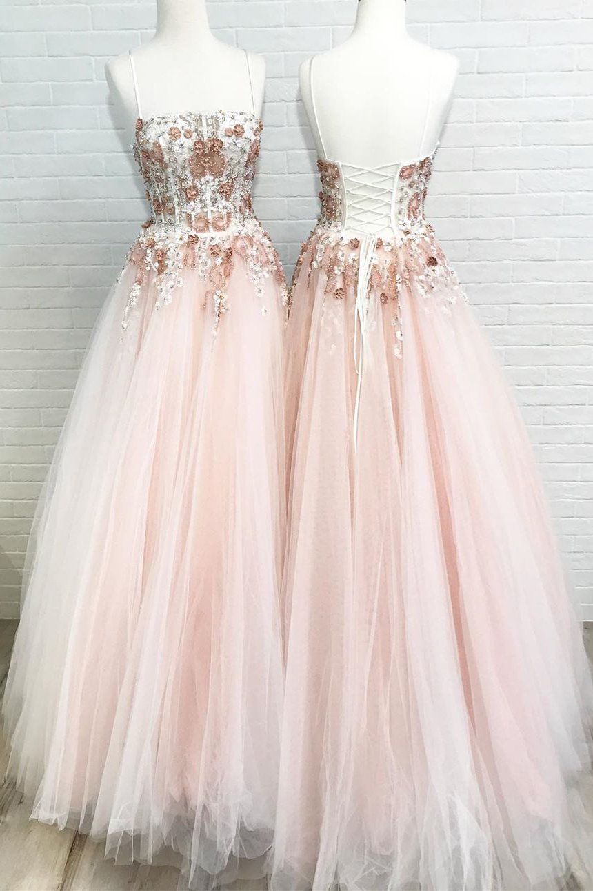 fashion pink spaghetti-straps tulle full length school event dress,sleeveless applique prom dress,SB0610
