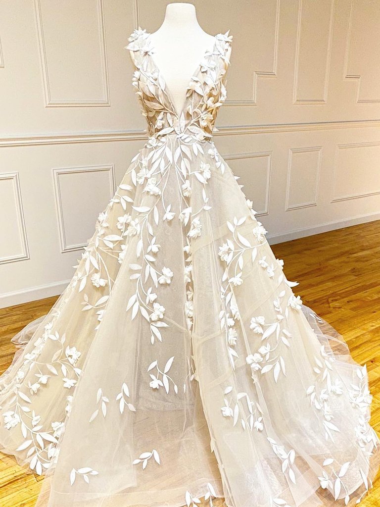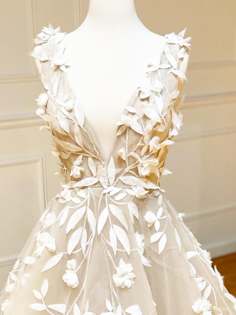 SB0733,Deep V Neck Champagne Lace Floral Long Prom Dresses V Neck Champagne Formal Evening Dresses
