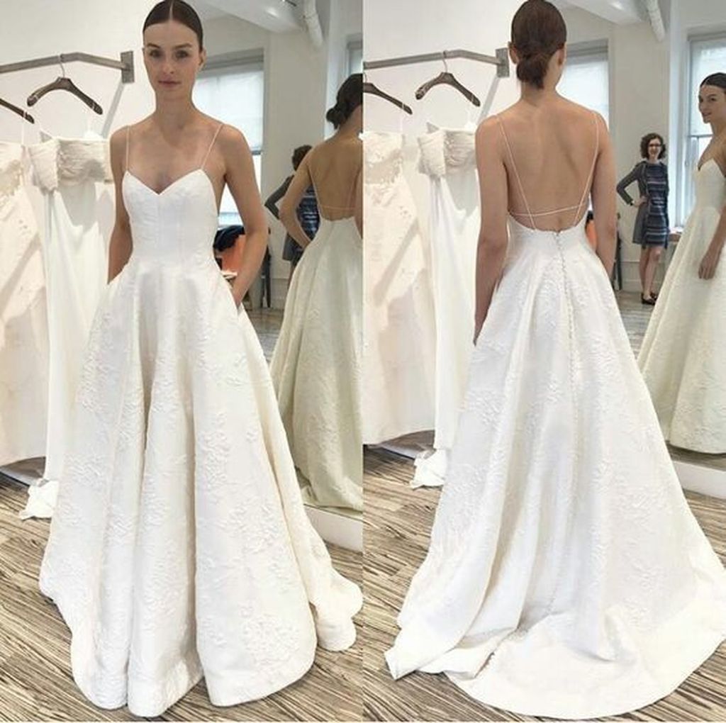 SB0668,beauty white sleeveless v-neck backless spaghetti-straps pocket satin wedding dress with applique
