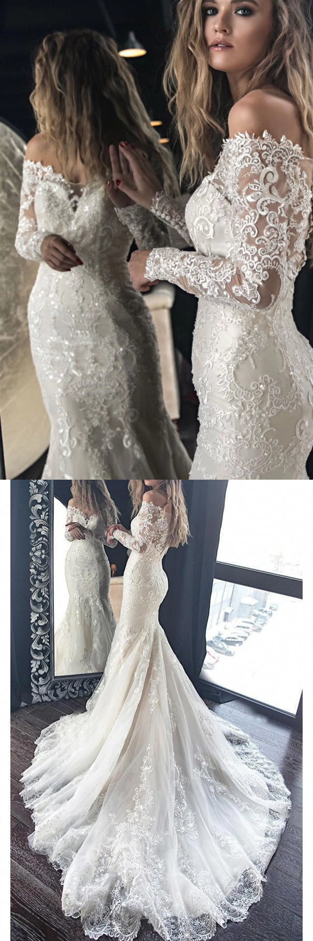 SB0678,Gorgeous Mermaid Wedding Dress with Long Sleeves, Lace Bridal Dress with Long Train