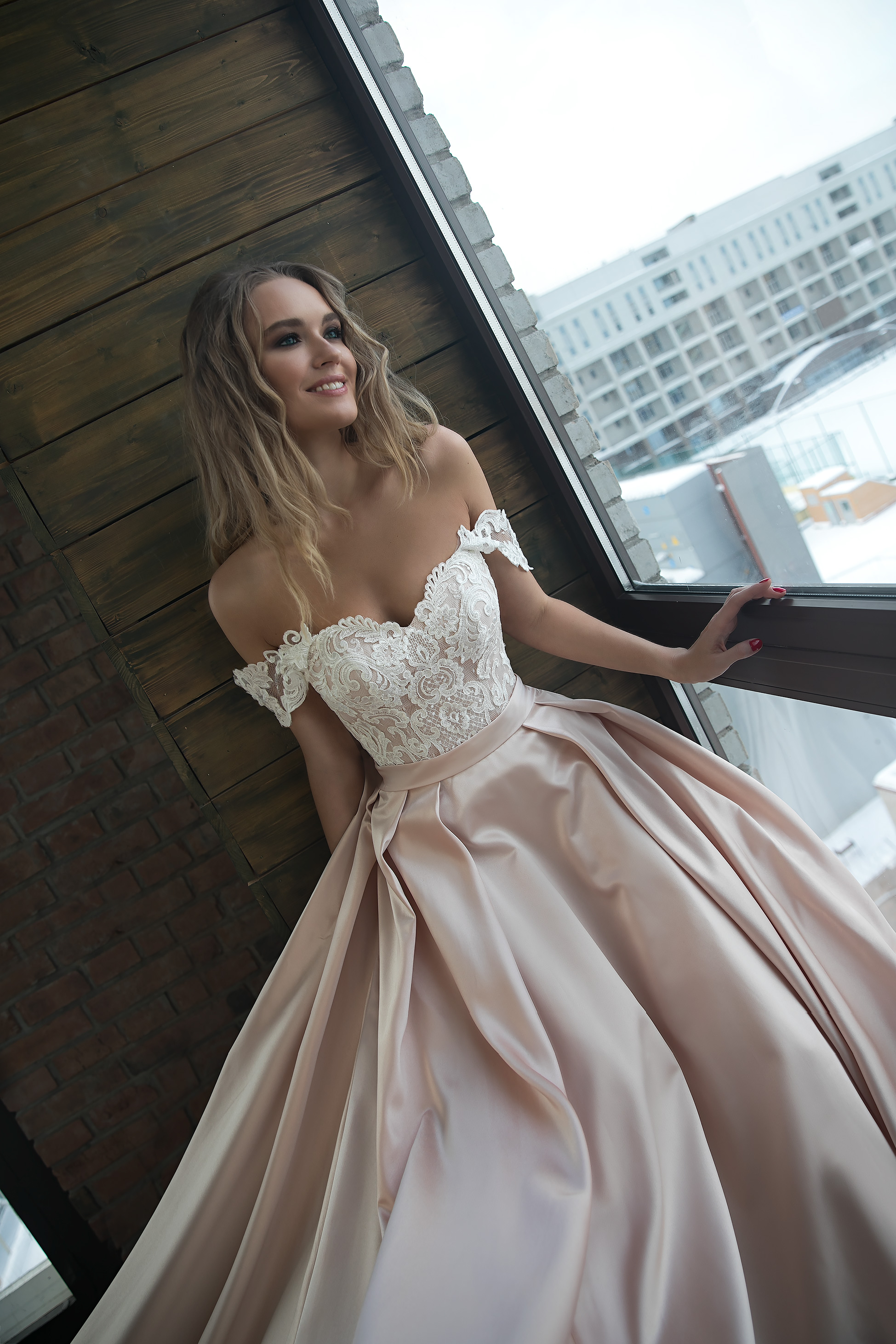 SB0679,Gentle off the shoulder cap sleeves applique v-neck satin lace long wedding dress