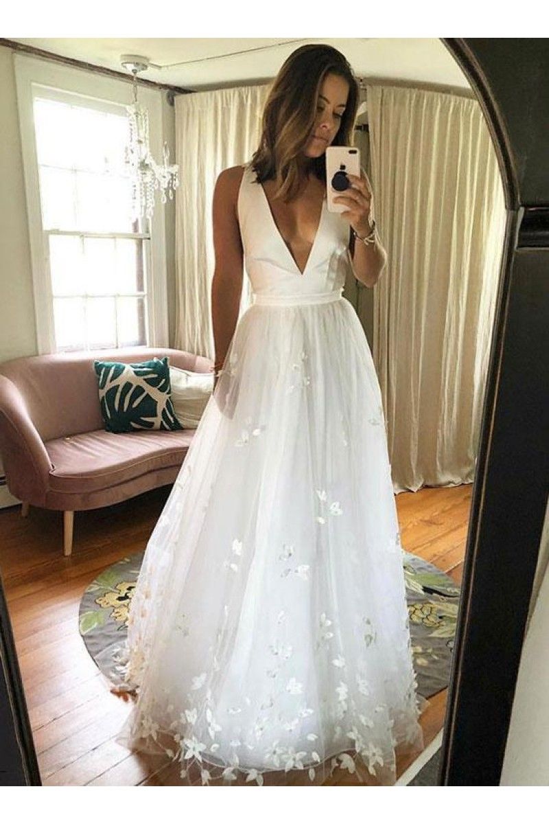 SB0681,Simple A Line Deep V Neck White Wedding Dresses with Appliques