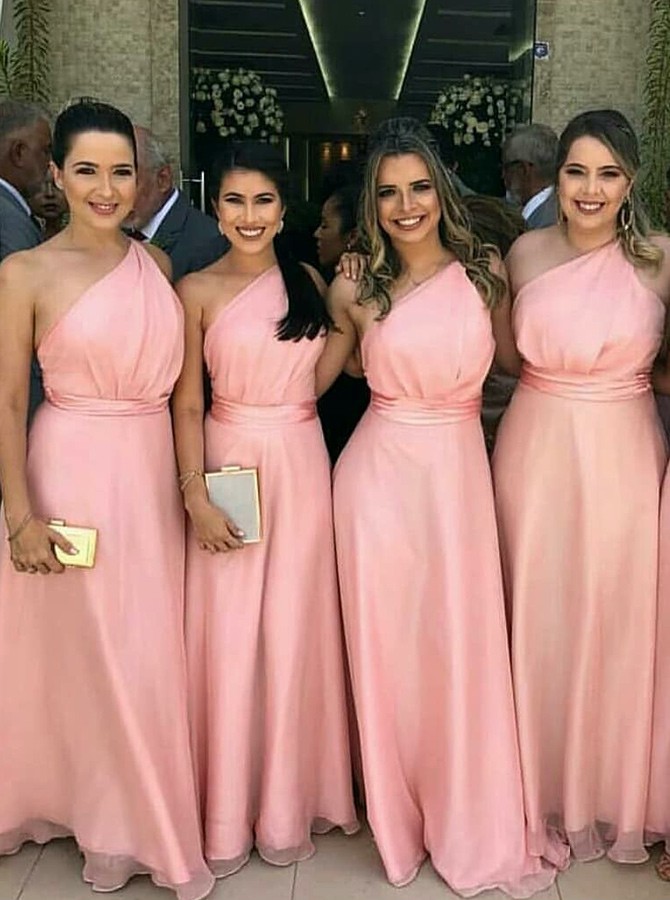 simple pink one shoulder sleeveless chiffon floor length bridesmaid dress ,SB0224