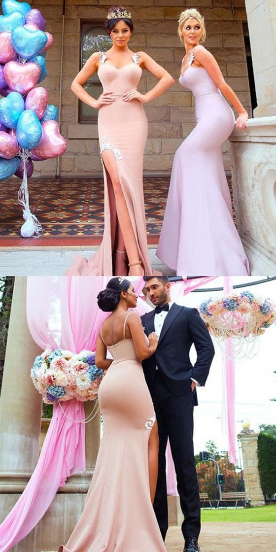 pink sleeveless spaghetti-straps women dresses,slit-skirt applique bridesmaid dress,SB0280