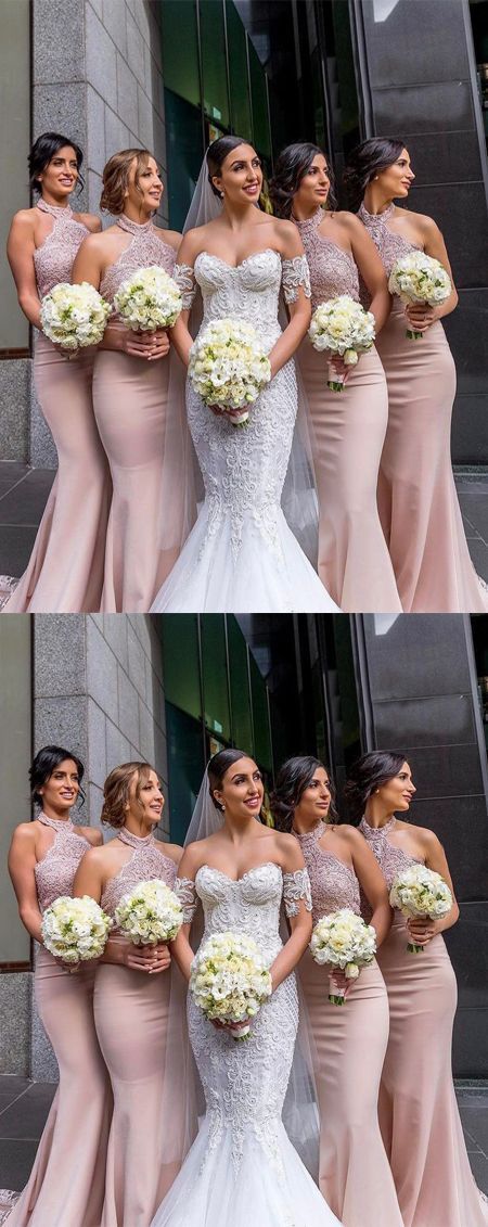 pink sleeveless women dresses,halter applique lace satin bridesmaid dress,SB0294