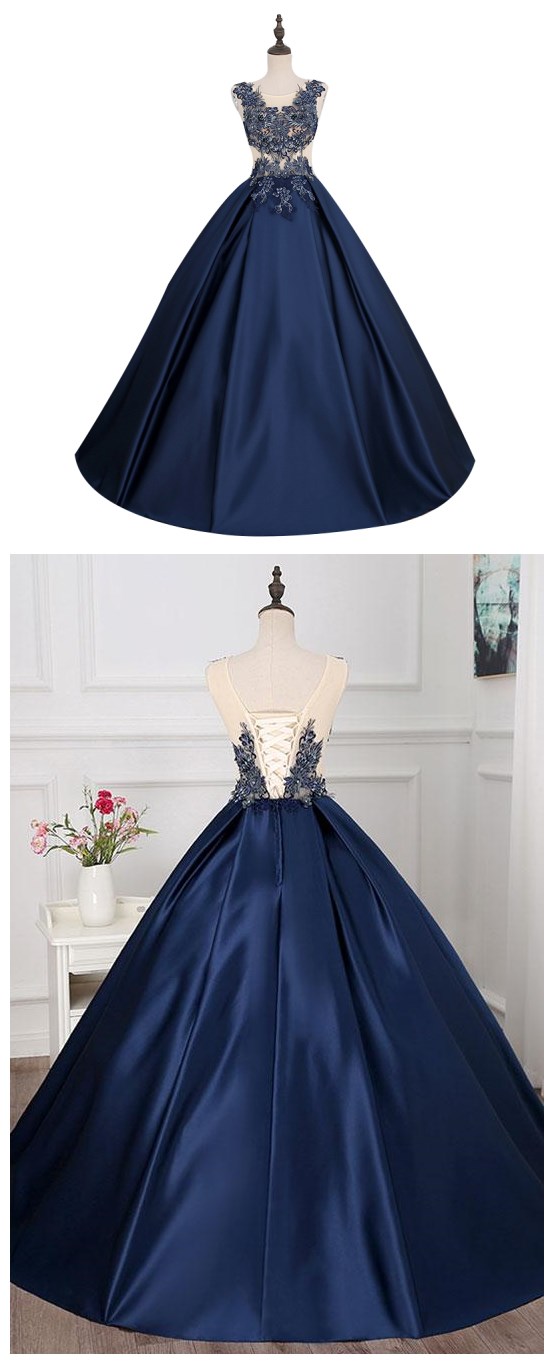 blue applique full length prom dresses,women dresses,sleeveless satin sweet 16 dress,SB0340
