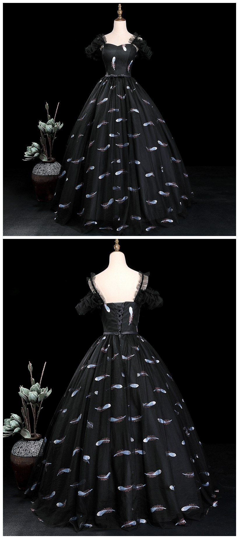 black applique tulle prom dresses,short sleeves sweetheart tulle sweet 16 dress,SB0355