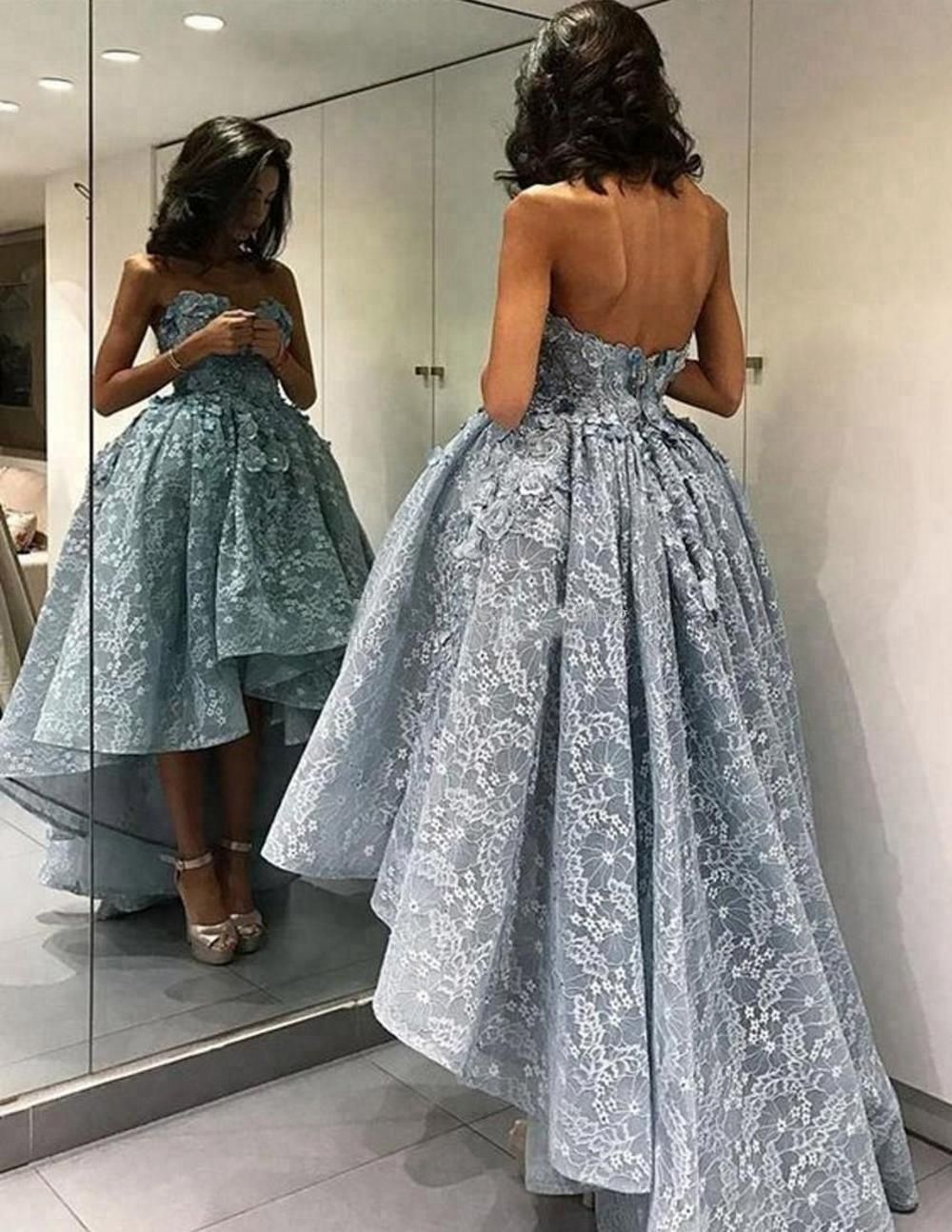 High low applique prom dresses sleeveless backless prom dresses sweetheart lace evening dress,SB043