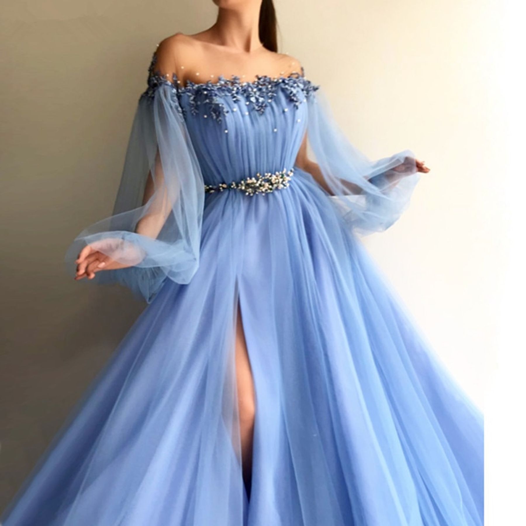 Blue strapless prom dresses long sleeves lace prom dresses applique off the shoulder evening dresses,SB054