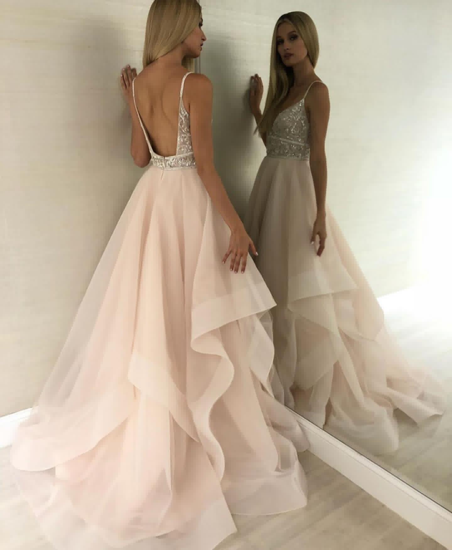 Light champagne backless beaded prom dress,v-neck tulle spaghetti-straps party dress,SB071