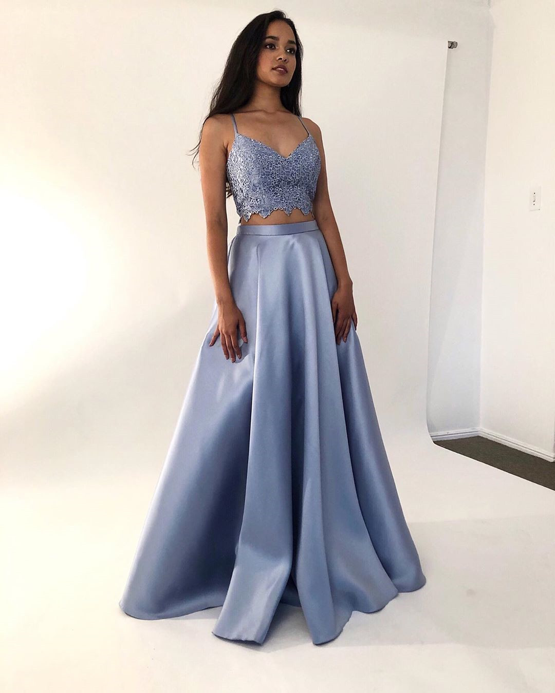 two piece applique prom dress,spaghetti-straps v-neck satin evening dress,SB085