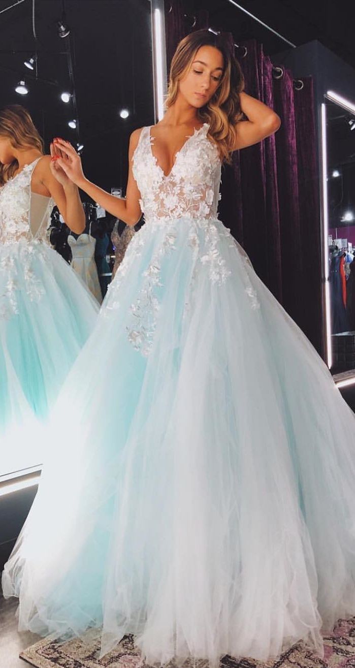 fanshion sky blue tulle lace sleeveless prom dress,applique v-neck evening dress,SB086