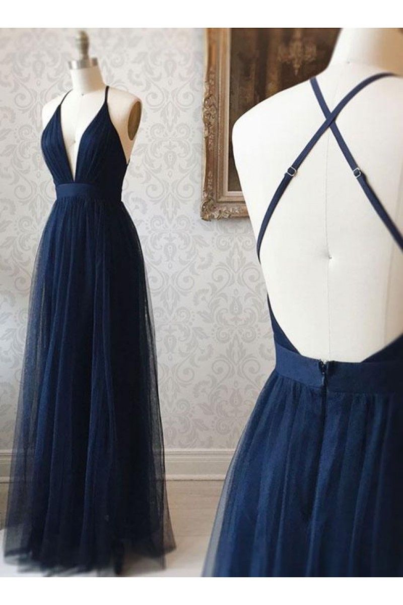 blue spaghetti-straps long prom dress,tulle sleeveless backless racer-back evening dress,SB092