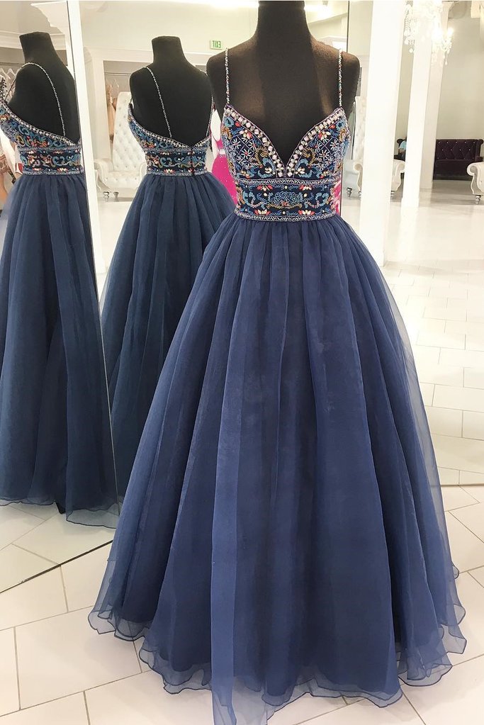 Blue sleeveless beaded prom dresses, spaghetti-straps applique tulle evening dresses,SB109
