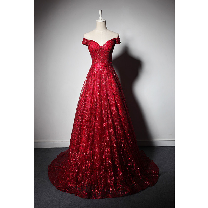Beautiful red off the shoulder prom dresses, sweetheart sequins long evening dress, SB111
