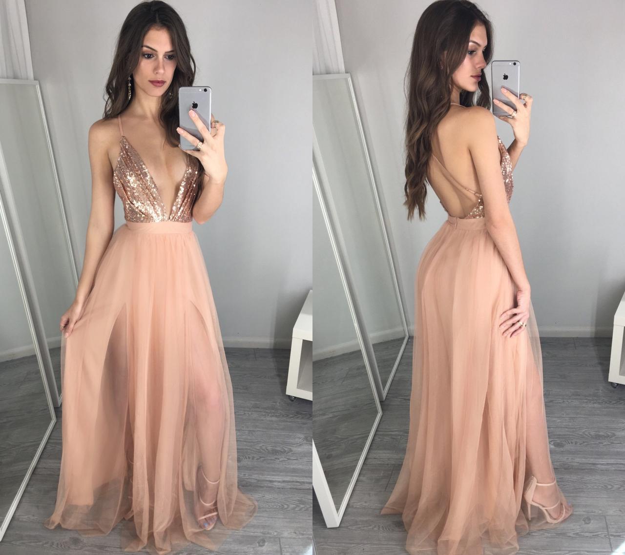 champagne sleeveless sequins backless racer-back long prom dresses,spaghetti-straps slit-skirt evening dress,SB0310