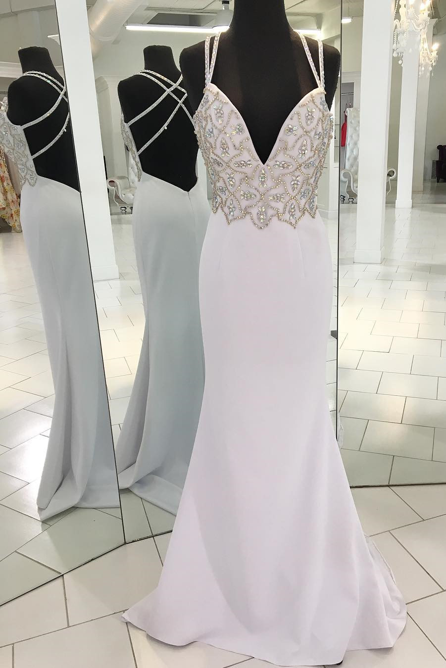 white applique backless satin long prom dresses,v-neck sleeveless spaghetti-straps evening dress,SB0314