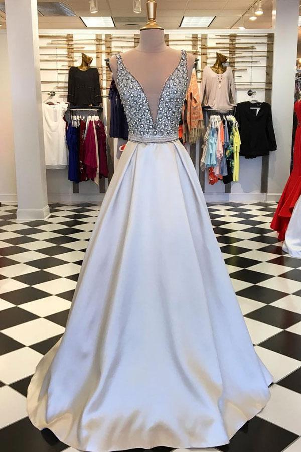 gray sleeveless v-neck prom dresses,spaghetti-straps satin evening dress with beaded,SB0319