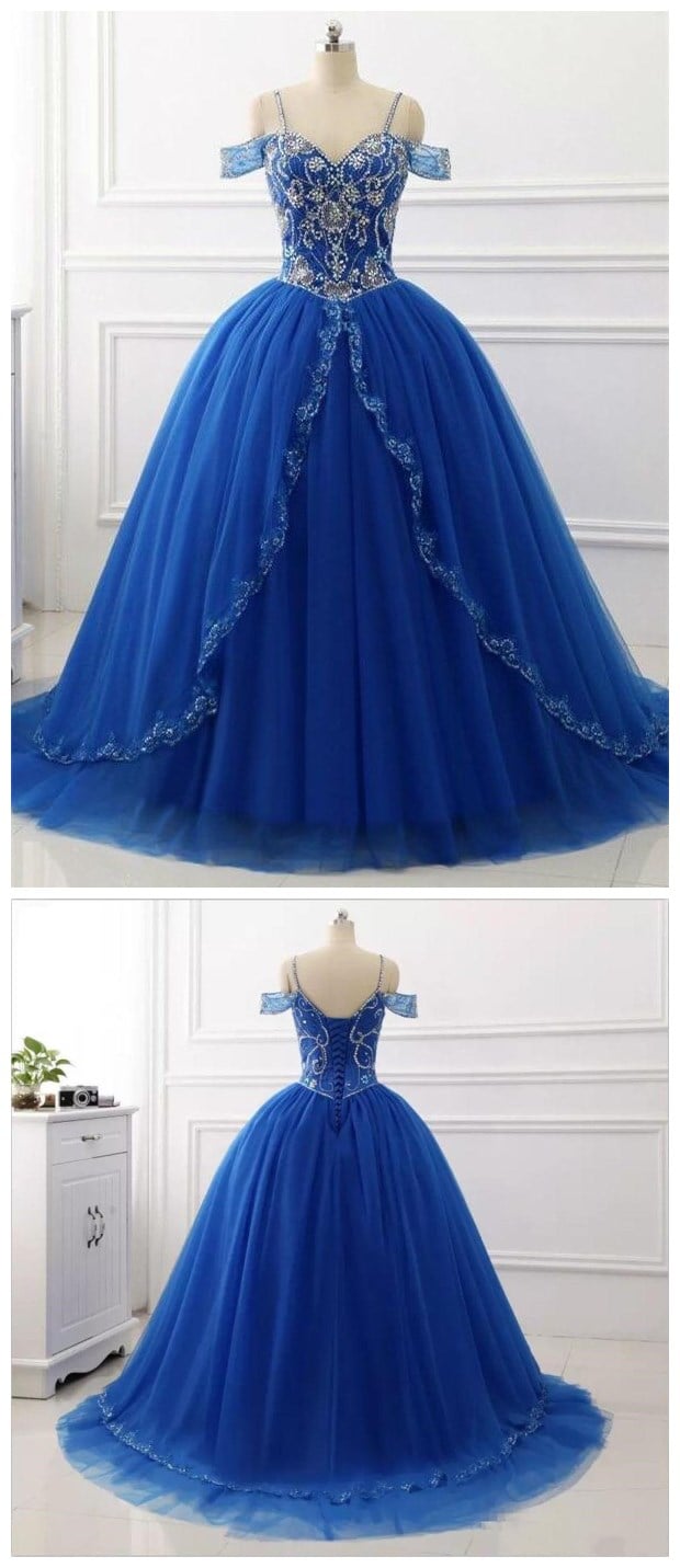 blue off the shoulder v-neck short sleeves prom dresses,spaghetti-straps applique tulle sweet 16 dress,SB0320