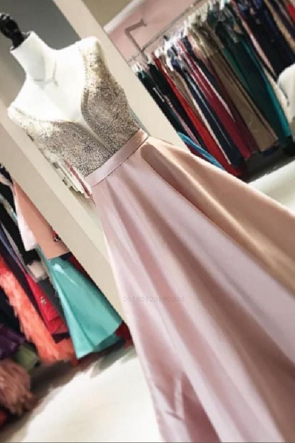 pink sleeveless v-neck prom dresses,satin beading long evening dress,SB0337