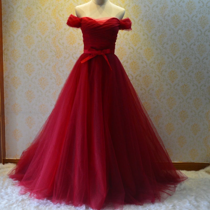 red short sleeves tulle prom dresses,off the shoulder v-neck bow-knot long evening dress,SB0353