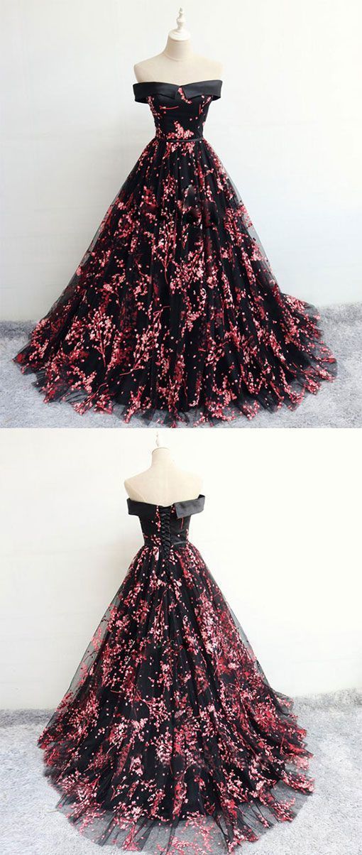 black off the shoulder strapless prom dresses,short sleeves applique tulle lace satin sweet 16 dress,SB0439
