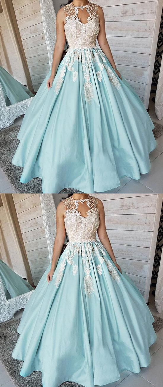 beautiful blue satin prom dresses women dresses,white applique sleeveless lace evening dress,SB0467