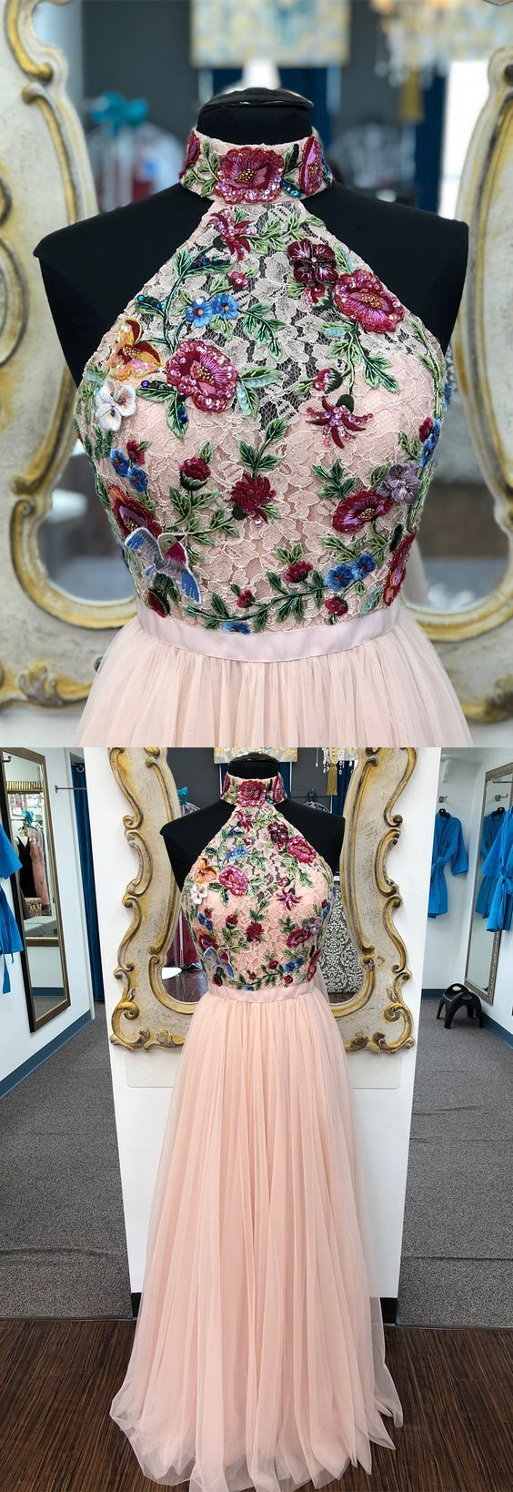 pink halter prom dresses women dresses,applique tulle sleeveless lace tulle beaded evening dress,SB0478