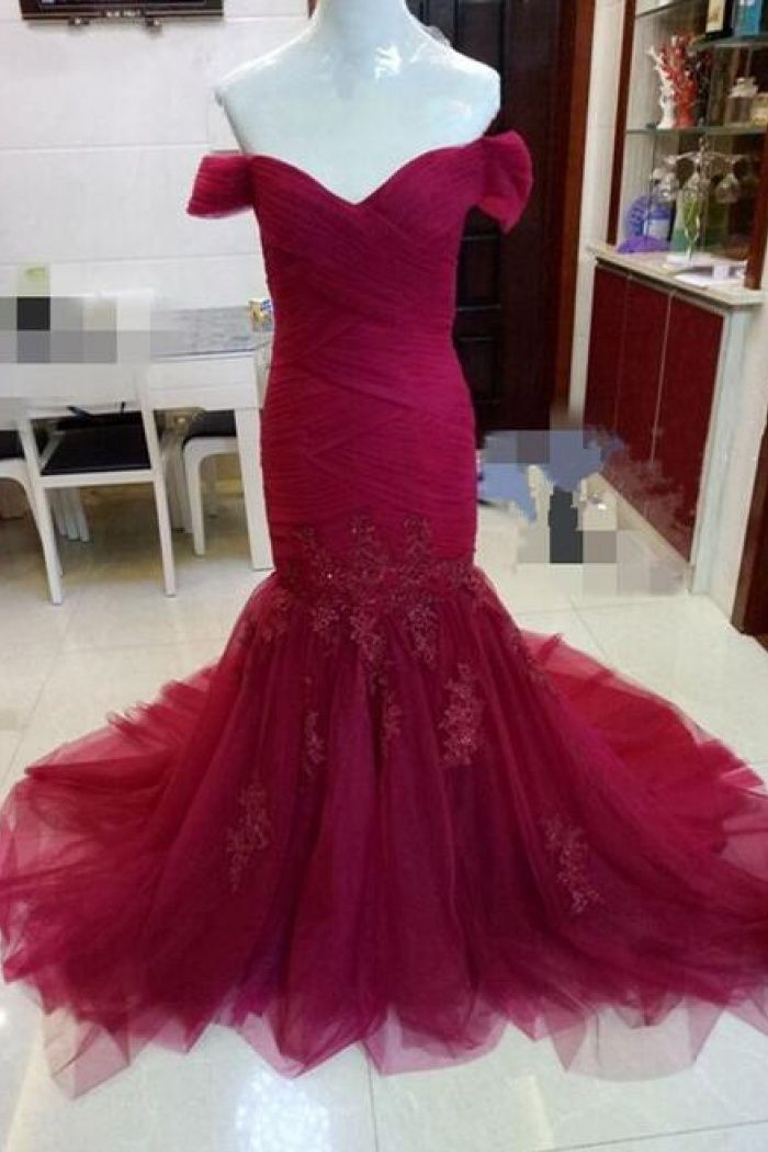 burgundy off the shoulder prom dresses women dresses,v-neck tulle applique evening dress,SB0492