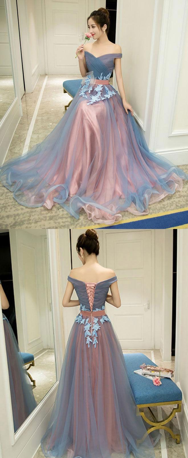 blue off the shoulder tulle prom dress,v-neck pink satin applique evening dress,SB0506