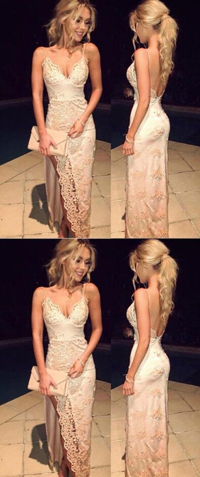 white slit-skirt applique v-neck prom dress,sleeveless spaghetti-straps backless evening dress,SB0543