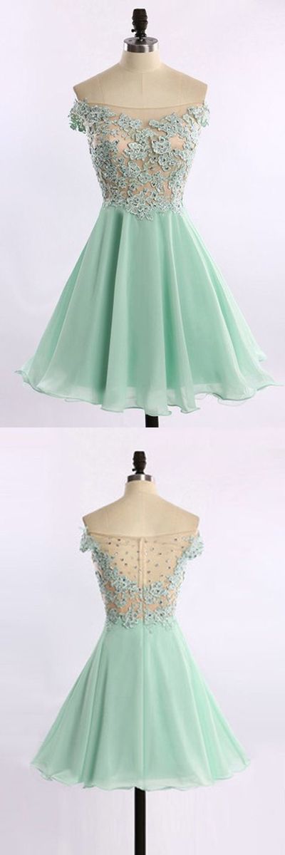 green chiffon applique short fanshion dress,off the shoulder v-neck short sleeves homecoming dress,SB0562