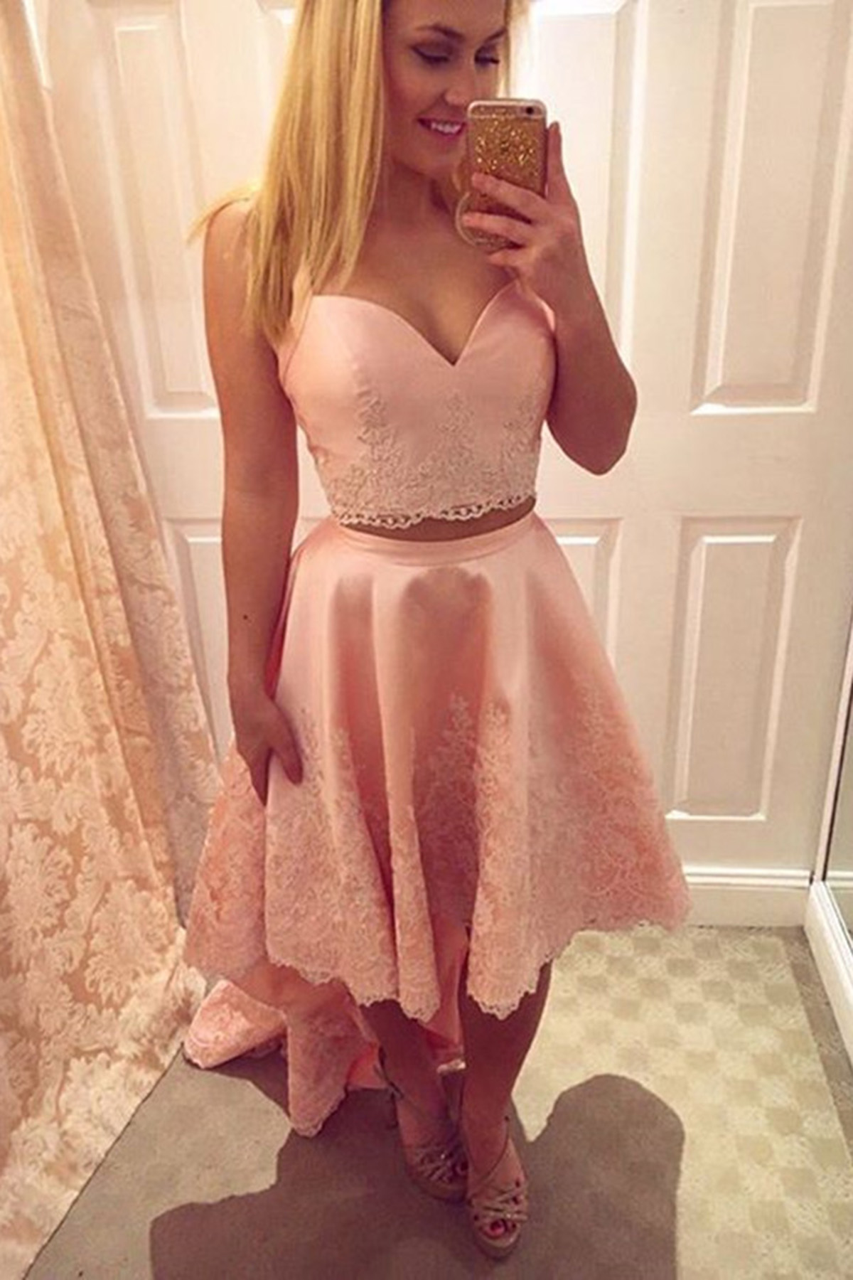 pink sleeveless v-neck fanshion dress,midi dress,applique lace satin high low homecoming dress,SB0603