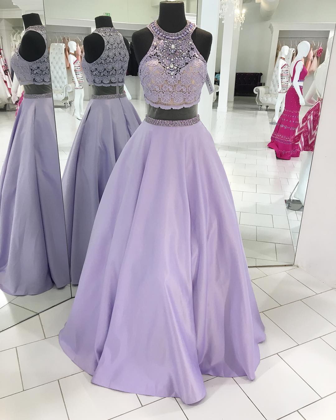 High Neck Lavender Lace Beaded Prom Dress,Two Piece A-Line Evening Dress,SB0640