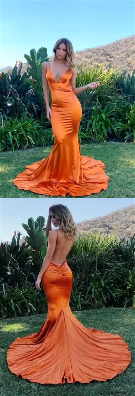 long orange sleeveless v-neck backless prom dress,spaghetti-straps satin long school event dress,SB0626