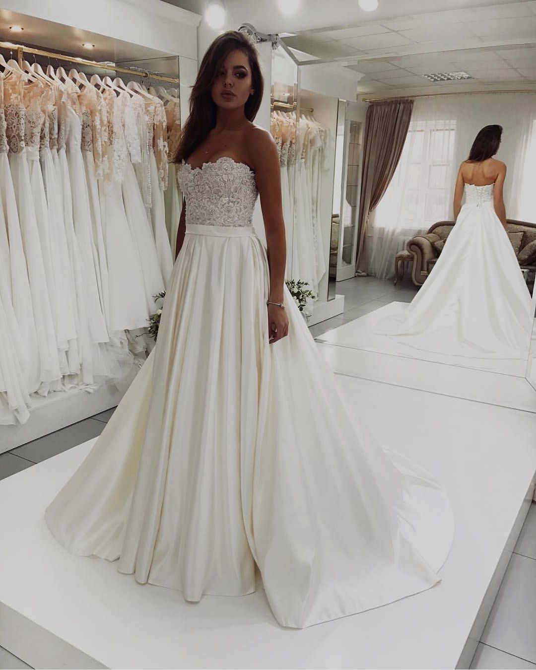 SB0673,Elegant Lace Up Strapless Sweetheart Applique Lace Satin Long Wedding Dresses