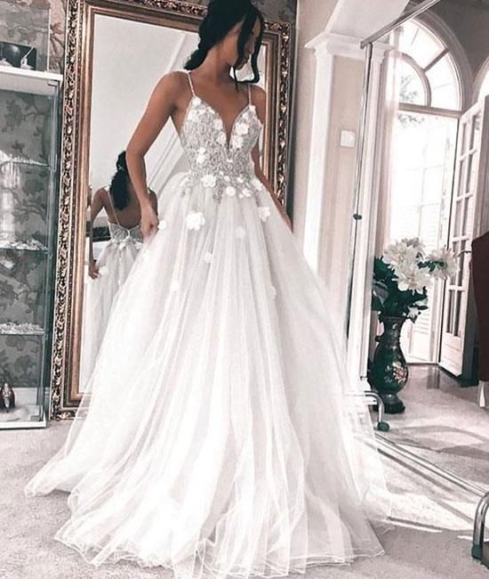 SB0683,White V Neck Prom Dresses Beaded Tulle Evening Dresses Applique Wedding dress