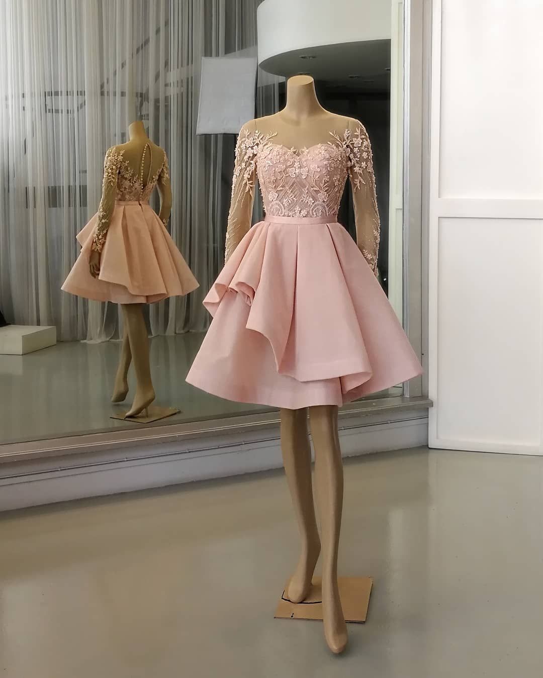 SB0701,pink jewel sweetheart long sleeves sheer-straps applique satin lace homecoming dress