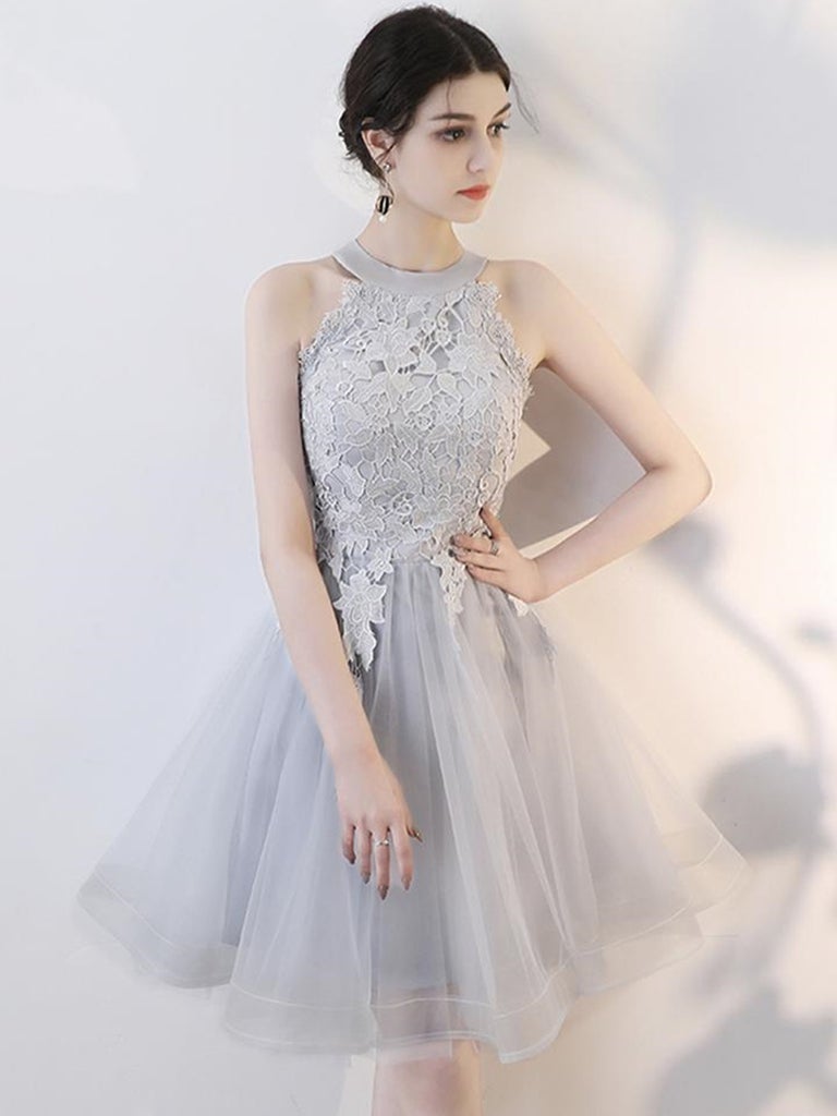SB0721,Off Shoulder Short Grey Lace Prom Dresses, Grey Lace Formal Graduation Homecoming Dresses