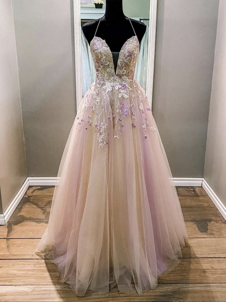 SB0735,A Line V Neck Backless Pink Lace Floral Long Prom Dresses V Neck Pink Formal Dresses Pink Lace Evening Dresses
